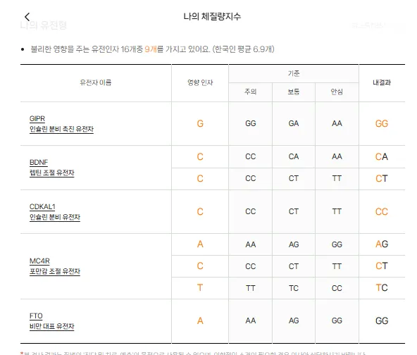 - 나의 비만 결과 표에는 GIPR 유전자가 GA라고 나오는데 체질량 지수 결과표에는 GG인 등,